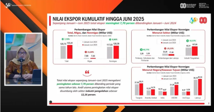 Total ekspor Januari-Juni 2025 mencapai 135,41 miliar dolar AS, kemudian meningkat 7,70 persen dibandingkan periode yang sama pada tahun 2024.
