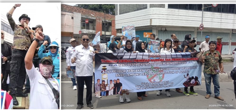 Yang sebelumnya pada tanggal 8 September 2025 sudah pernah Audensi di BNNP. Dalam rapat itu tuntutan kami dari Aliansi anti narkoba menuntut Tiga Poin, di antaranya menangkap kembali pelaku memakai narkoba yang tertangkap di Karoke Hotel Grand Mercury oleh BNNP. Kesepakatan tuntutan di Terima langsung oleh Kepala Plt BNNP Karyoto, meminta waktu enam hari, tetapi sampai waktu yang dj janjikan tidak ada kabar akhirnya pada hari ini 16/9/2025 Masa mengerucut Kantor BNNP lampung. Untuk meminta keadilan dan keputusan kapan akan kembali dj tangkap pelaku ku penguna narkoboy.
