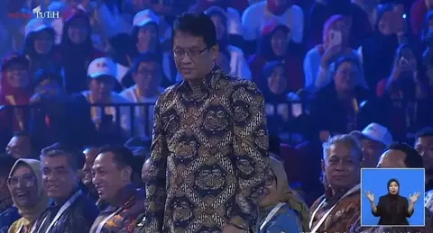 Tak hanya Purbaya, momen meriah juga terjadi saat Abdul Mu’ti menyapa Seskab Letkol Teddy Indra Wijaya. Sama seperti sebelumnya, ribuan guru memberikan sambutan berupa tepuk tangan meriah yang menggema di Indonesia Arena.