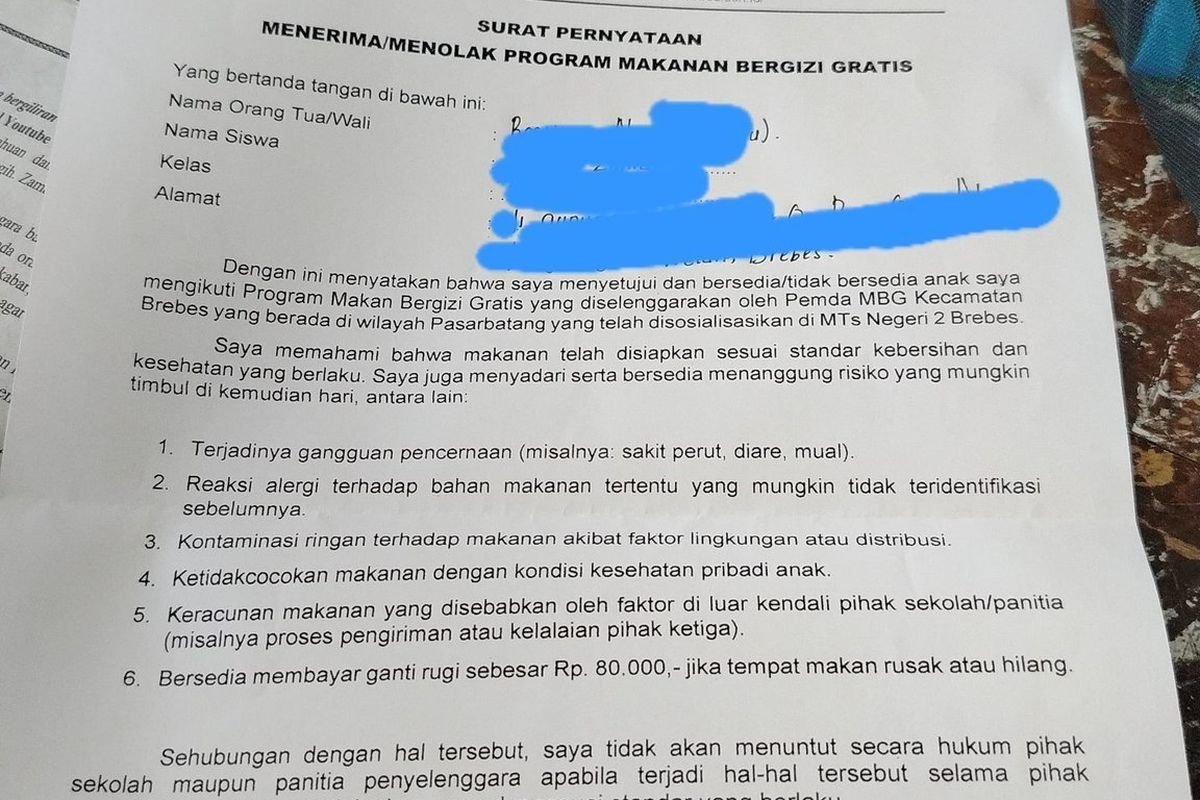 Dalam sebuah postingan di X, akun @ubege*** memperlihatkan isi surat yang meminta orangtua untuk menerima atau menolak program MBG, sekaligus menanggung risiko yang mungkin timbul. “Ini di Brebes guys. Negara itu salah satu tujuannya melindungi segenap bangsa Indonesia. Ini ortu murid disuruh menanggung resiko dari makanan MBG. Pak @prabowo @setkabgoid @KemensetnegRI please….” tulisnya pada Senin (15/9/2025).