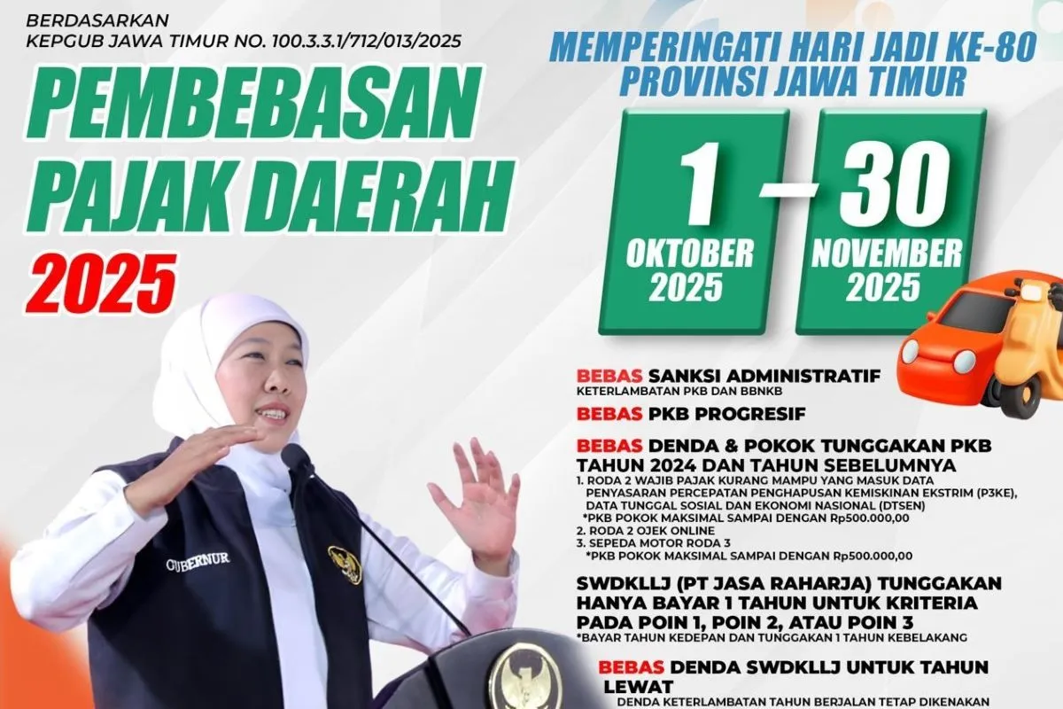 “Saya mengajak seluruh warga Jawa Timur untuk tidak menyia-nyiakan kesempatan ini. Segera manfaatkan pembebasan pajak daerah mulai 1 Oktober hingga 30 November. Mari kita ringankan beban bersama. Pemerintah hadir memberi kemudahan, dan bersama-sama, kita wujudkan Jawa Timur yang semakin maju, inklusif, menuju gerbang baru Nusantara,” katanya.