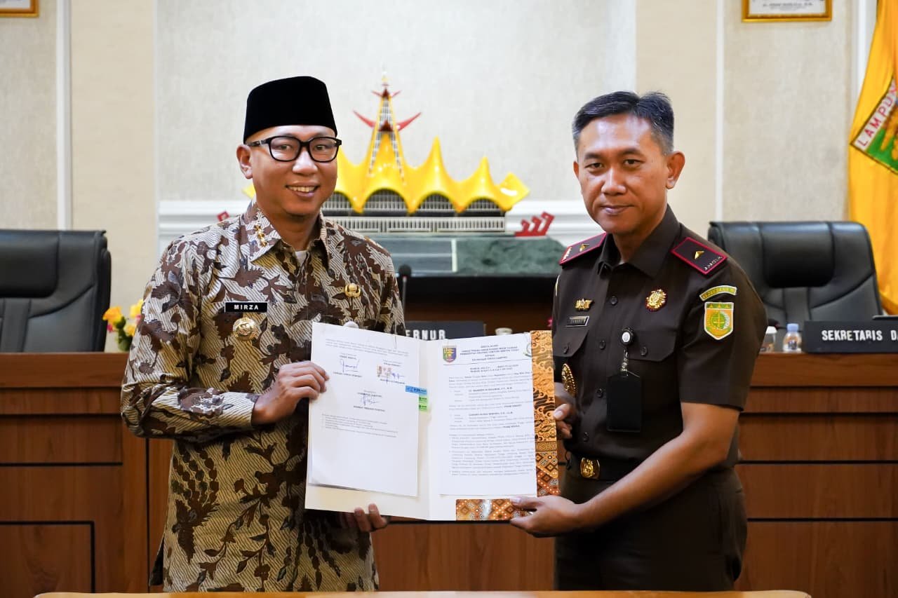 Pemerintah Provinsi Lampung bersama Kejaksaan Tinggi (Kejati) Lampung menandatangani nota kesepahaman atau Memorandum of Understanding (MoU) terkait pendampingan, pengamanan, dan pengawalan program strategis daerah. Penandatanganan dilakukan di Ruang Rapat Utama Kantor Gubernur Lampung, Jumat (26/9/2025).
