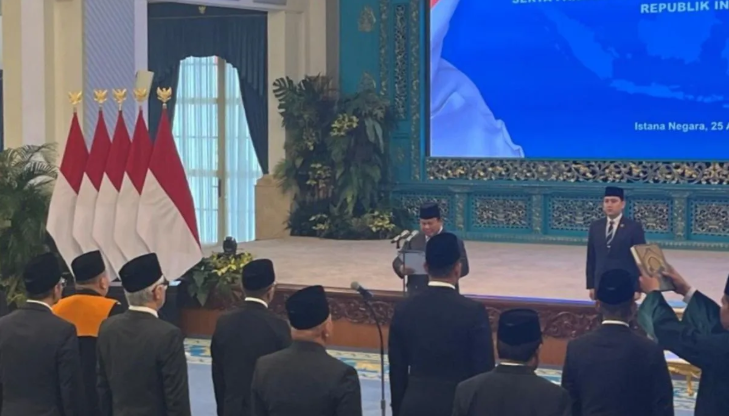 Usai pembacaan keputusan presiden dan daftar nama pejabat yang akan dilantik, Presiden Prabowo kemudian memimpin prosesi pengambilan sumpah jabatan yang diikuti oleh jajaran pejabat baru yang dilantik.