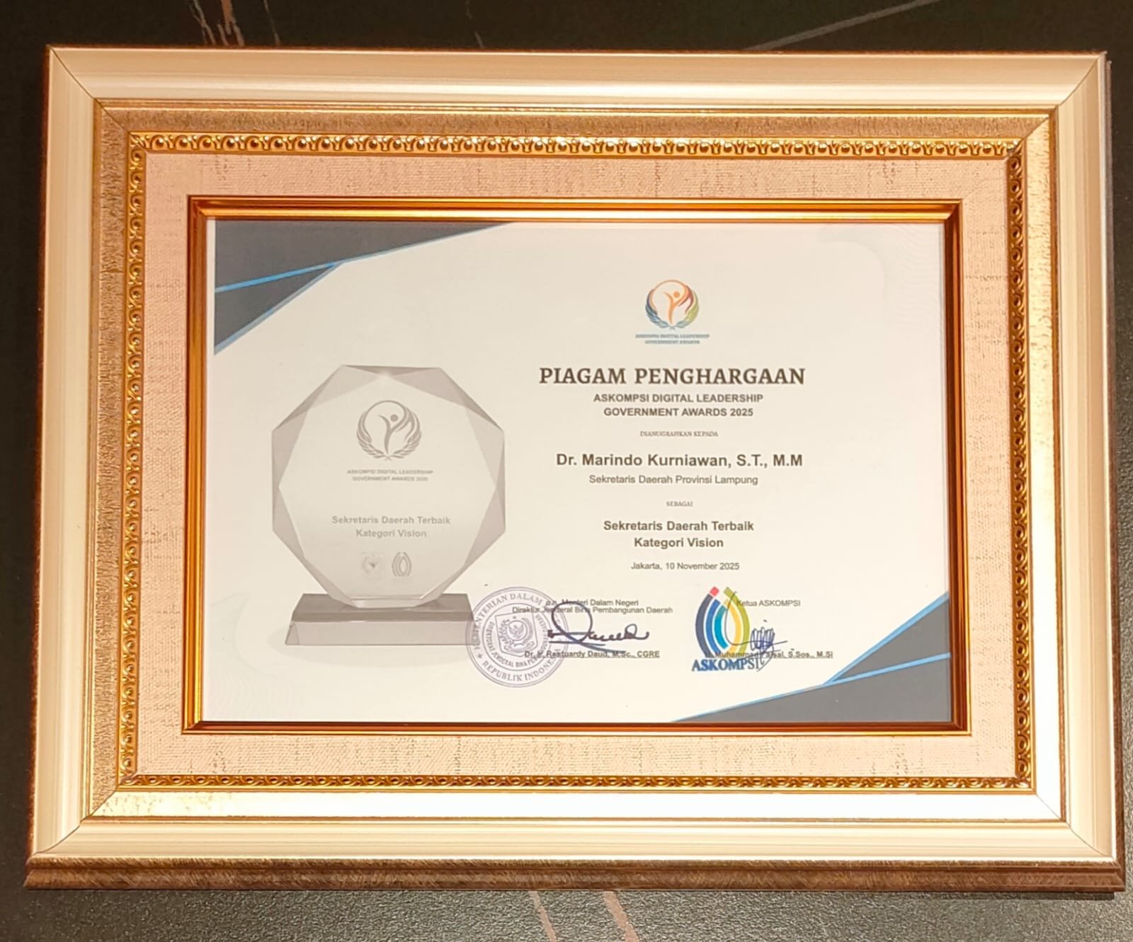 Surabaya,(www.Ampera-News.com)-Pemerintah Provinsi Lampung kembali menorehkan prestasi di tingkat nasional, Sekretaris Daerah Provinsi Lampung, Dr. Marindo Kurniawan, S.T., M.M., meraih penghargaan Sekda Terbaik Kategori Vision dan berhasil menempati peringkat ke-4 nasional pada ajang ASKOMPSI Digital Leadership Government Award 2025, yang berlangsung di Hotel Mercure, Jalan Raya Darmo, Surabaya, pada Kamis (20/11/2025).