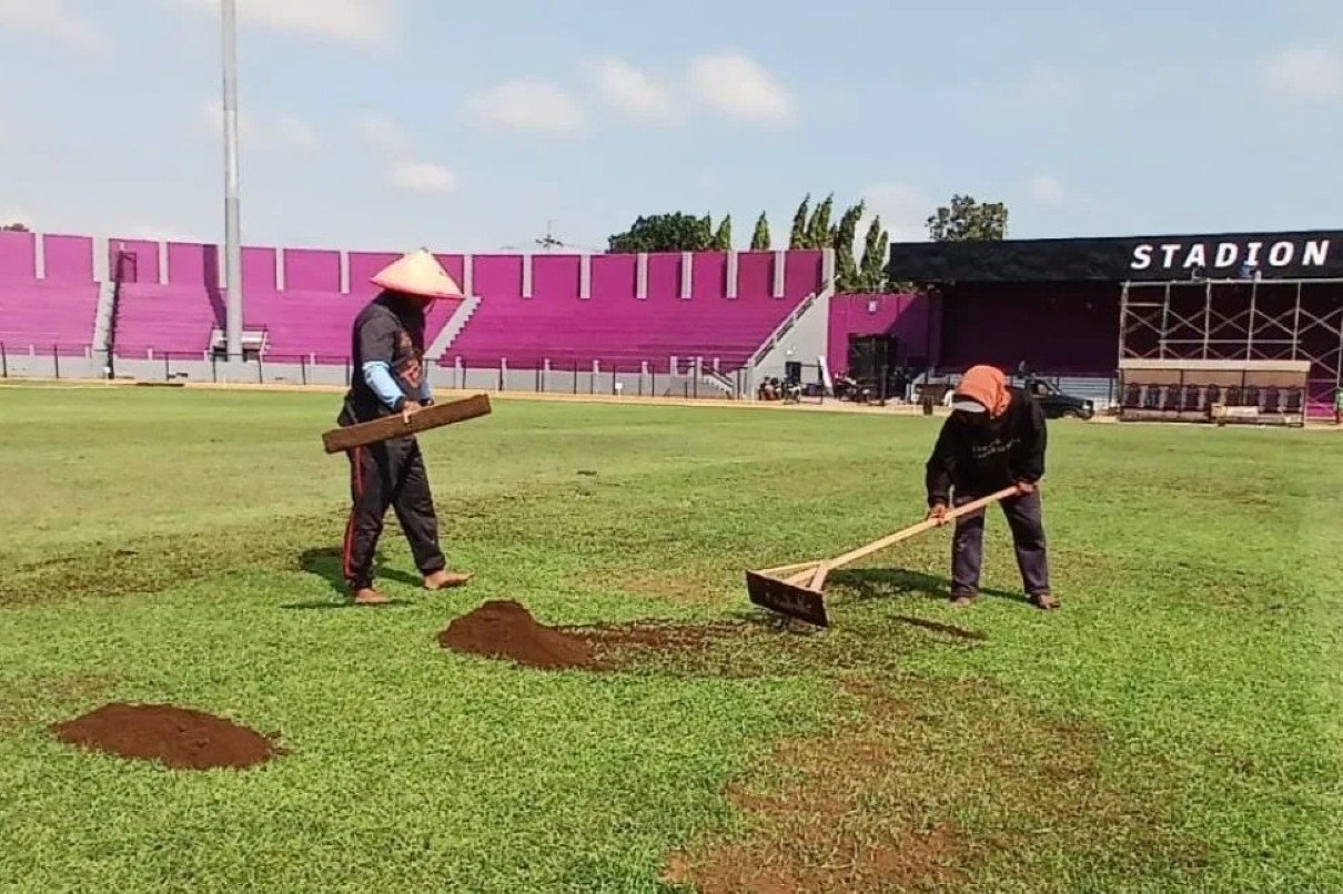 Tri mengatakan pengurukan menggunakan tanah khusus dari Malang. Begitu juga untuk tambal sulam juga diambil dari rumput khusus dari Malang. “Sekarang rumput hijau, warna hampir sama. Jenis rumput sama, yang sulit tumbuh ditanami lagi, belinya dari Malang. Sebagai tambal sulam ada beberapa space yang sulit berkembang. Jadi, dari kemarin sudah ditanami biar rata hijau,” ujarnya. Selain rumput, proses pengecatan stadion juga telah rampung 98 persen. Warna dominan ungu dan abu-abu menghiasi bangku dan tribun barat.