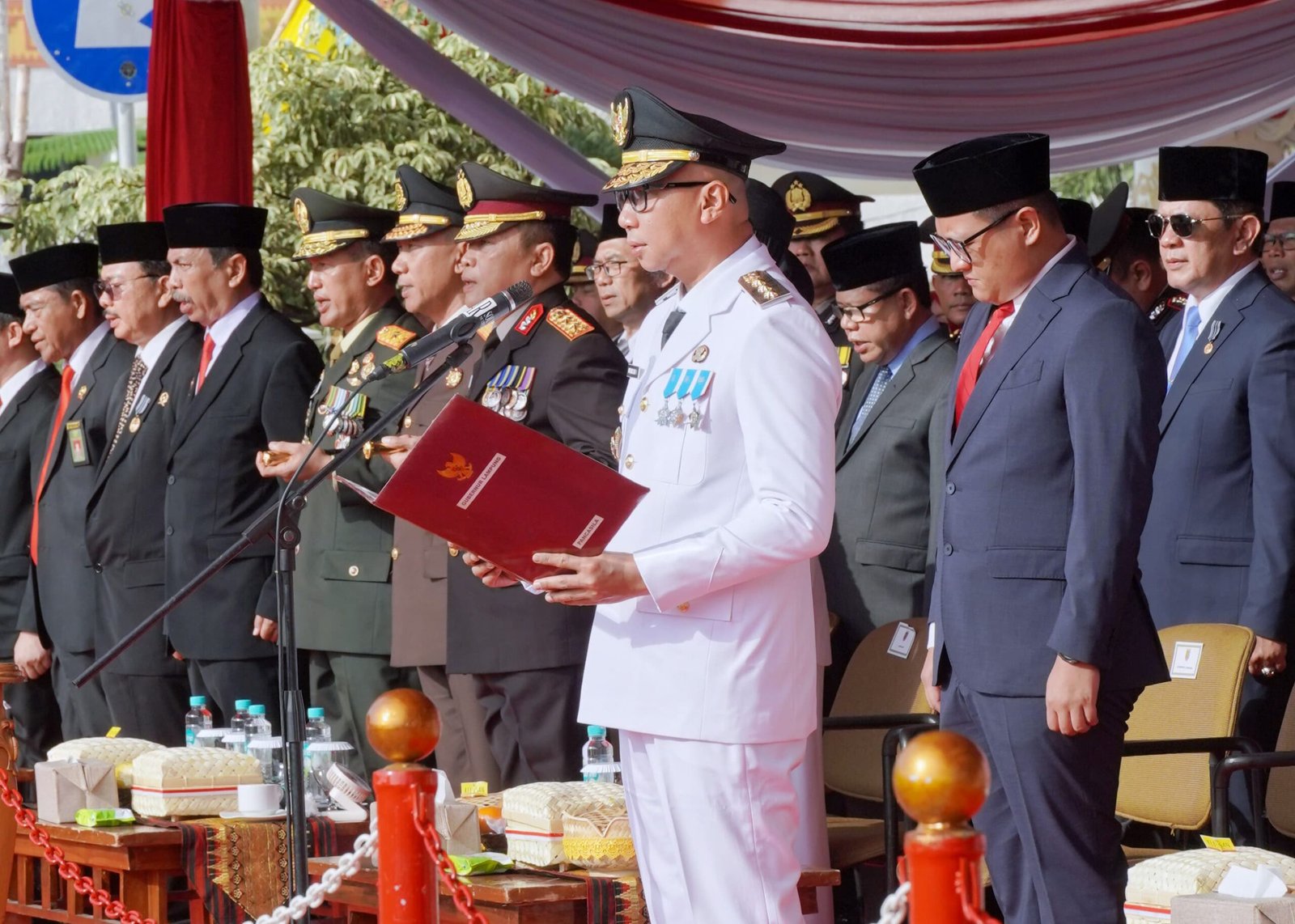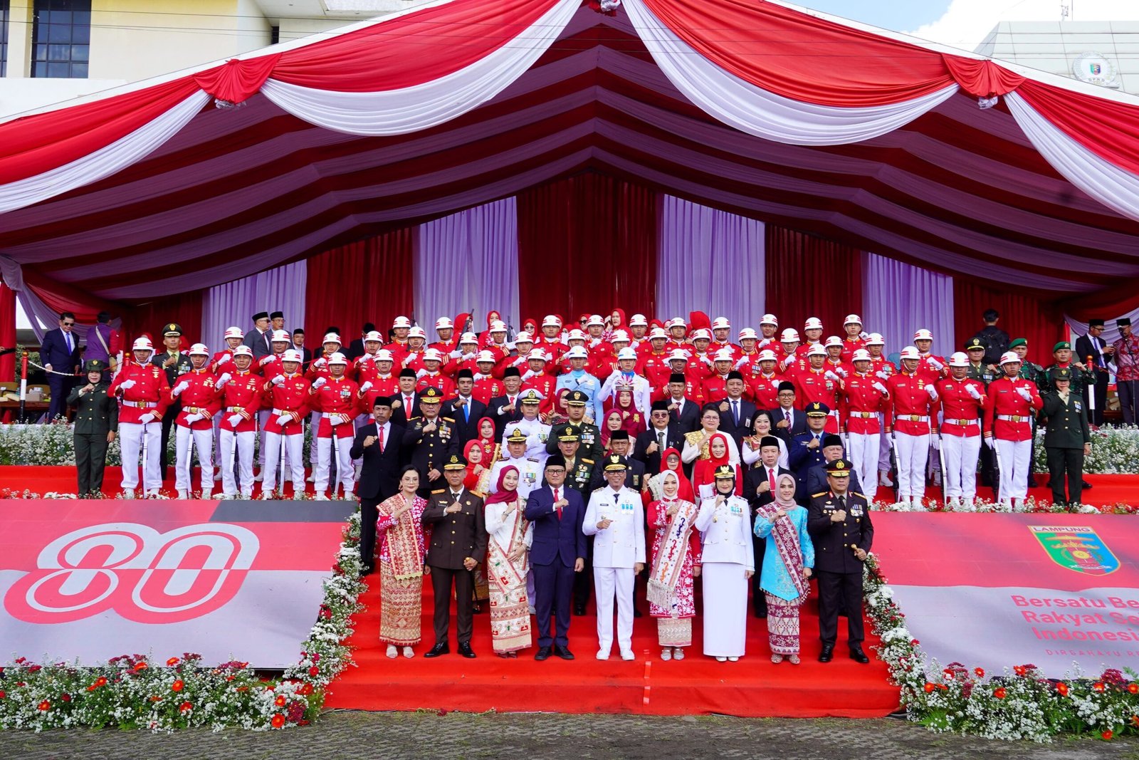 “Delapan dekade yang lalu, para pendiri bangsa dengan gagah berani memproklamasikan kemerdekaan. Hari ini tugas kita adalah melanjutkan perjuangan itu dengan kerja nyata,” ucap Gubernur.